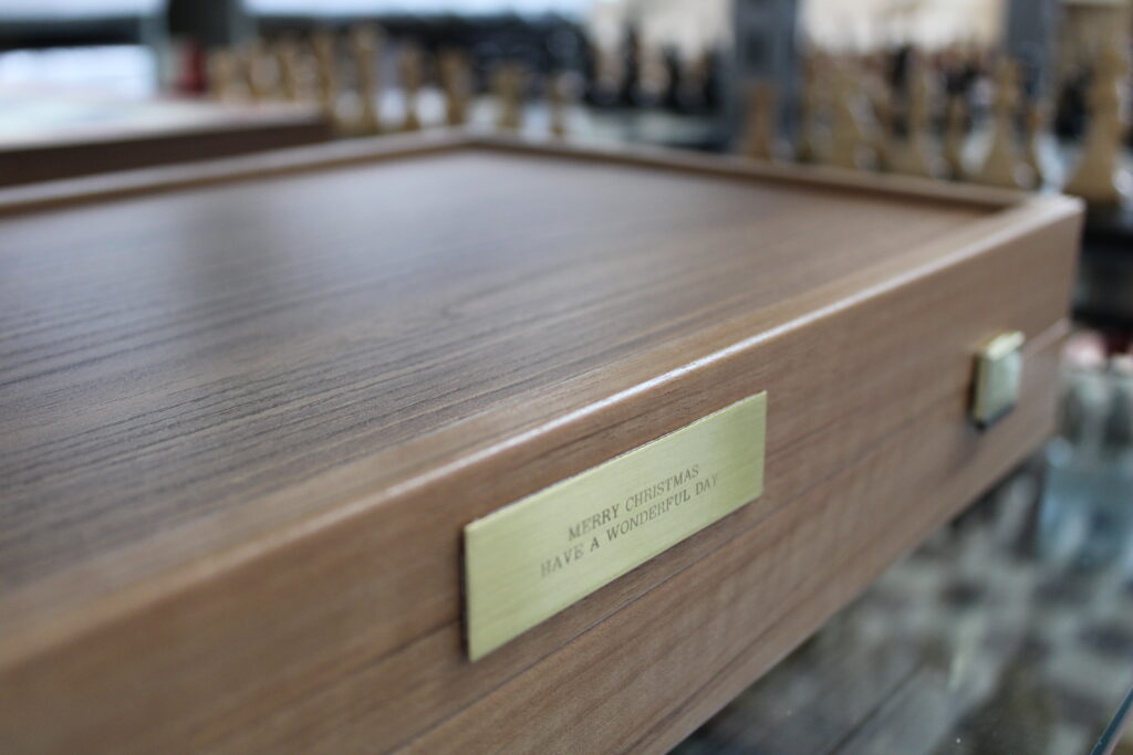 Wir heißen unsere Kunden auch herzlich willkommen, uns vor ihrem Kauf persönlich zu besuchen, und wir sind stolz darauf, unsere feine Sammlung handgefertigter Schachspiele oder sogar unsere Backgammon-Spiele in Meisterschaftsgröße von angesehenen Marken zu präsentieren. Unsere Auswahl umfasst alles, was Sie als Backgammon-Enthusiast oder vielleicht als Schachfan suchen, alles sichtbar in der Ausstellung. Unser Team heißt Sie bei Ihrem Besuch persönlich willkommen, rufen Sie uns einfach an und vereinbaren Sie einen Termin. Wir haben unseren Sitz in Leicester, Großbritannien und werden in Zukunft auch in London verfügbar sein.