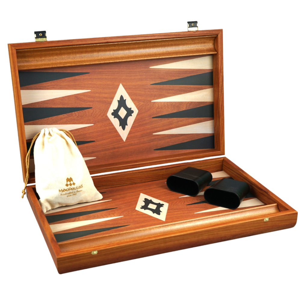 Erfreuen Sie sich an der Eleganz dieses exquisiten Backgammon-Sets aus Mahagoniholz, das eine luxuriöse Oberfläche aufweist und überlegene Handwerkskunst widerspiegelt. Handgefertigt im wunderschönen Griechenland von den geschickten Handwerkern bei Manopoulos, verfügt dieses Set über Holzprägungen aus verschiedenen hochwertigen Hölzern. Das sorgfältig gefertigte Backgammon-Brett wird von Backgammon-Steinen mit Marmoreffekt, Würfeln und Würfelbechern begleitet, was ein wirklich hochwertiges Spielerlebnis gewährleistet. Mit Metallverschlüssen an jeder Seite schließt das Brett sicher, ein Zeugnis seiner handgefertigten Präzision. Jedes Set enthält einen Manopoulos-Beutel mit Kordelzug, um Ihre Würfel und Backgammon-Steine zu schützen. Dieses bemerkenswerte Brett, das ein hervorragendes Preis-Leistungs-Verhältnis bietet, ist jetzt über Chessgammon erhältlich und wird durch elegante Seitenfächer zur praktischen Aufbewahrung der Spielsteine während des Spiels ergänzt.
