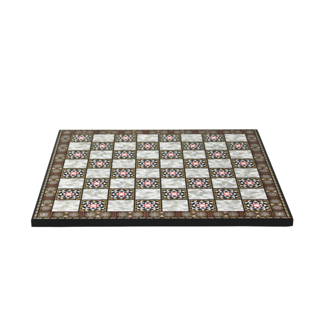 Wir präsentieren unser Mutterperlen-Schachbrett, akribisch gefertigt mit Haltbarkeit und Eleganz im Sinn. Hergestellt aus 12 mm erstklassigen MDF-Platten, behalten unsere Schachbretter ihre starre Form und Struktur bei und garantieren lang anhaltende Freude an Ihren Spielen. Um Ihr Spielerlebnis zu verbessern, sind die Spielflächen mit einem hochglänzenden (95%) Acryl-UV-Lack beschichtet. Dieser Lack ist nicht vergilbend, frei von Lösungsmitteln, geruchsneutral und dampffrei und bietet eine glatte und strapazierfähige Oberfläche, die die Schönheit des Brettes unterstreicht. Die Seiten der Bretter sind mit einer Hochglanz-PVC-Kantenband verziert, was dem Set eine Note von Raffinesse verleiht und die Kanten vor Abnutzung schützt. Für Stabilität während intensiver Matches sind vier selbstklebende Antirutsch-Pads unter den Brettern angebracht, die ein unerwünschtes Verrutschen während Ihrer nächsten Spielzüge verhindern. Erleben Sie die perfekte Mischung aus Qualität, Stil und Funktionalität mit unserem Schachbrett, das dazu bestimmt ist, Ihr treuer Begleiter durch unzählige Partien voller Geschick und Strategie zu sein.