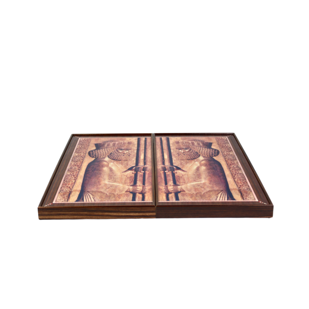 In the spirit of Persepolis and its rich cultural heritage, our Artwork & Premium Backgammon sets offer both elegance and durability. The main frames are constructed from 16mm and 4mm First Quality MDF Boards, ensuring a sturdy and lasting shape.Following precise profiling and measurement, the MDF parts undergo a wrapping phase with PU glue and wood-decorated High-Gloss PVC foils, tailored to the unique characteristics of each product type.The inner and outer playing surfaces receive a luxurious touch with High Glossy (95%) Acrylic UV Cured Varnish, providing a durable and smooth finish that is resistant to yellowing, solvents, odors, and vapor.In place of traditional metal clips, our sets feature high-grade Neodymium Magnets for secure closure, adding a modern touch to the design. Optional accessories include plastic, acrylic, or polyester chips, larger dices, doubling cubes, and dice cups, depending on the specific product model.Inspired by the historical reliefs in Persepolis depicting representatives of the various nations of the Persian Empire, our Artwork & Premium Backgammon sets combine cultural heritage with modern craftsmanship for an exquisite gaming experience.