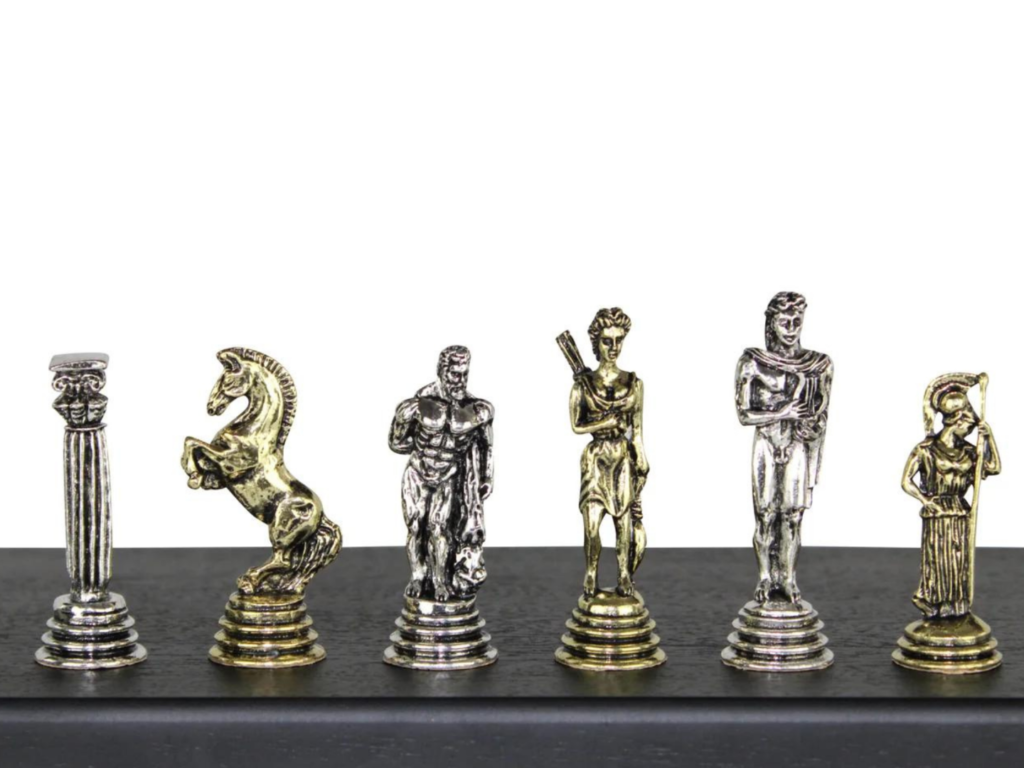 Erlebe die Weisheit und Stärke der griechischen Göttin mit unseren Athena Metall-Schachfiguren, gefertigt aus einer langlebigen Legierung aus Nickel und Messing. Diese 2,5-Zoll-Schachfiguren sind sorgfältig gestaltet, um die Eleganz und Macht der antiken griechischen Kultur zu verkörpern. Die Kombination aus Nickel und Messing sorgt für einen auffälligen Kontrast, wodurch sich die Figuren sowohl für das Spielen als auch zur Ausstellung eignen. Diese langlebigen Figuren sind die perfekte Wahl für Sammler und Schachliebhaber, die historische Themen und hochwertige Handwerkskunst schätzen.