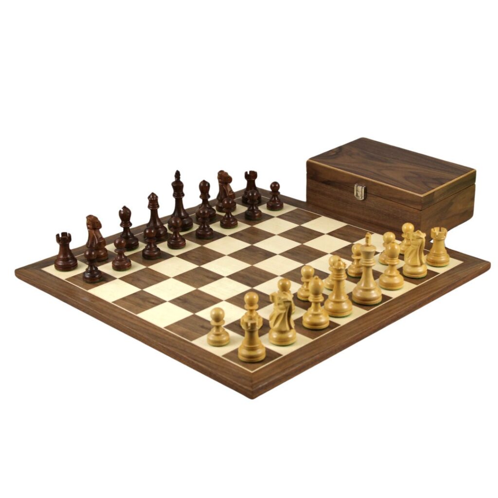 The Walnut Chess Set boasts a 20-inch wooden chessboard adorned with inlaid squares, featuring Walnut for the darker squares and Maple for the lighter ones, ensuring both elegance and durability. This exceptional board, crafted in Spain, ensures years of enjoyment for enthusiasts. Paired with the board are weighted Sheesham Staunton Reykjavik chess pieces, part of the renowned Reykjavik Staunton Chess Series, also known as the Bobby Fischer, Jacob Knight, or Jacques Staunton Series. This esteemed set, with its rich history stemming from the 1972 Iceland chess tournament between Bobby Fischer and Boris Spassky, is meticulously manufactured by skilled artisans in Amritsar, India. Each piece is intricately carved from solid wood and meticulously weighted to provide a stable and comfortable gameplay experience. Moreover, all pieces are lined with soft green felt to safeguard the chessboard. Accompanying the set is a deluxe veneered chess piece storage box, crafted from walnut wood, providing ample space to store pieces ranging from 3 to 4 inches. The box is thoughtfully padded and coated in black velvet felt to ensure the protection of your cherished chess pieces. This Walnut Chess Set epitomizes sophistication, craftsmanship, and timeless appeal.