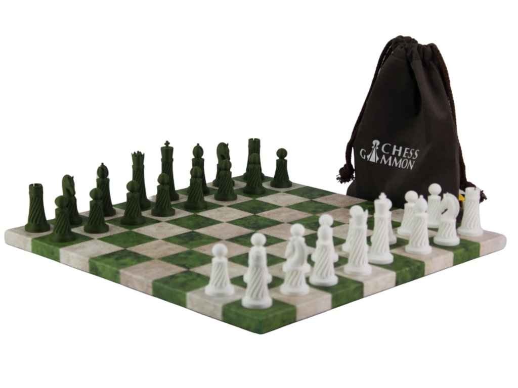 Die Figuren ruhen auf einem eleganten Schachbrett aus grünem Lederimitat, das Eleganz und Langlebigkeit ausstrahlt. Dieses Set ist ein außergewöhnliches Geschenk für Schachliebhaber oder eine besondere Ergänzung Ihrer eigenen Sammlung. Der mitgelieferte Zugbeutel sorgt für eine einfache Aufbewahrung und Tragbarkeit, sodass Sie Ihr Spiel überall hin mitnehmen können. Ob zur Dekoration oder zum Spielen, dieses Schachset vereint Luxus, Funktionalität und Umweltbewusstsein in jedem Zug.