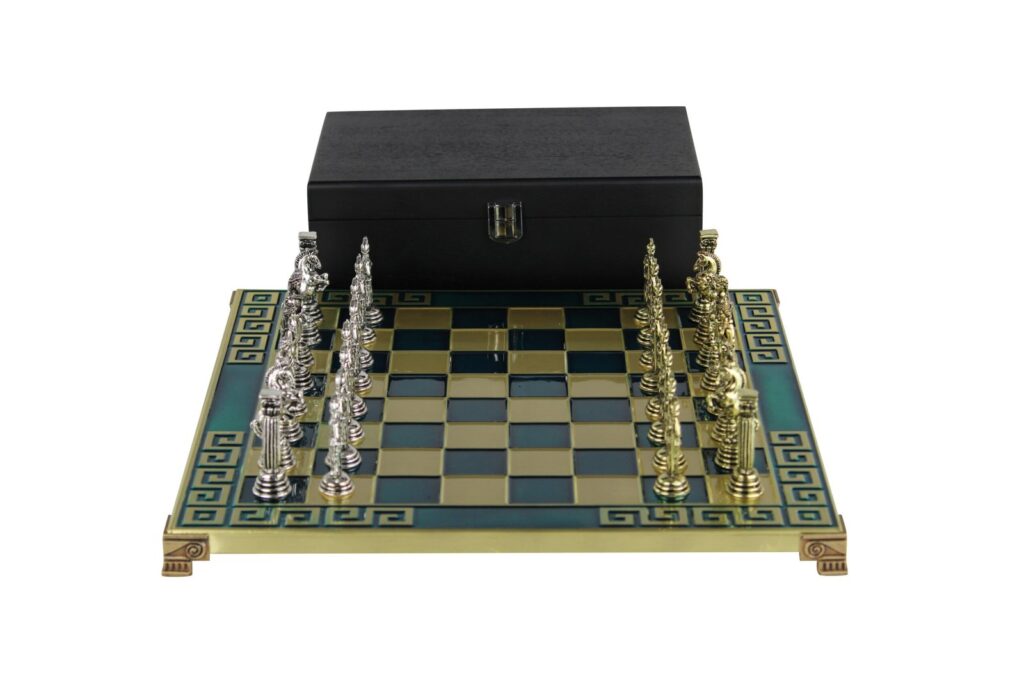 Betreten Sie eine Welt, in der strategische Meisterschaft auf zeitlose griechische Mythologie trifft, mit unserem bemerkenswerten 11-Zoll Blauen Griechischen Metall-Schachset. Dieses faszinierende Ensemble vereint nahtlos die Eleganz der griechischen Ästhetik mit der strategischen Tiefe des Spiels und schafft ein einzigartiges Meisterwerk, das sowohl Schachliebhaber als auch Sammler anspricht.