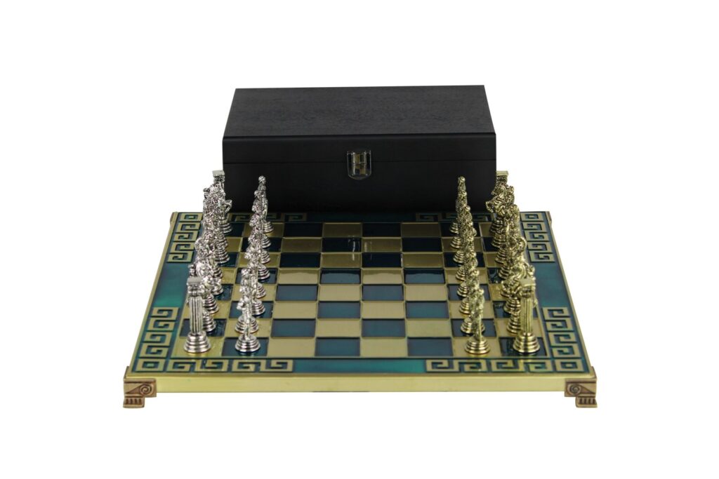 Im Zentrum dieses Sets stehen die römisch inspirierten Schachfiguren, die alle sorgfältig aus einer Mischung aus Messing und Nickel gefertigt sind. Diese Materialien gewährleisten Langlebigkeit und strahlen gleichzeitig einen luxuriösen Glanz aus, der die Pracht des antiken Rom würdigt. Vom mächtigen Caesar bis zu den tapferen Zenturionen und standhaften Legionären verkörpert jede Figur die Essenz der römischen Geschichte und ihre reiche Vielfalt an Kaisern, Soldaten und Eroberungen.