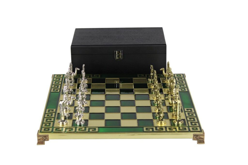 Entdecken Sie eine Welt historischer Mystik und strategischer Brillanz mit unserem außergewöhnlichen 13-Zoll Grünen Metall-Schachset. Dieses atemberaubende Ensemble verbindet den klassischen Reiz griechischer Ästhetik mit dem geheimnisvollen Charme antiker ägyptischer Symbolik und ergibt ein wahrhaft fesselndes Schachset, das sowohl Schachenthusiasten als auch Sammler anspricht.