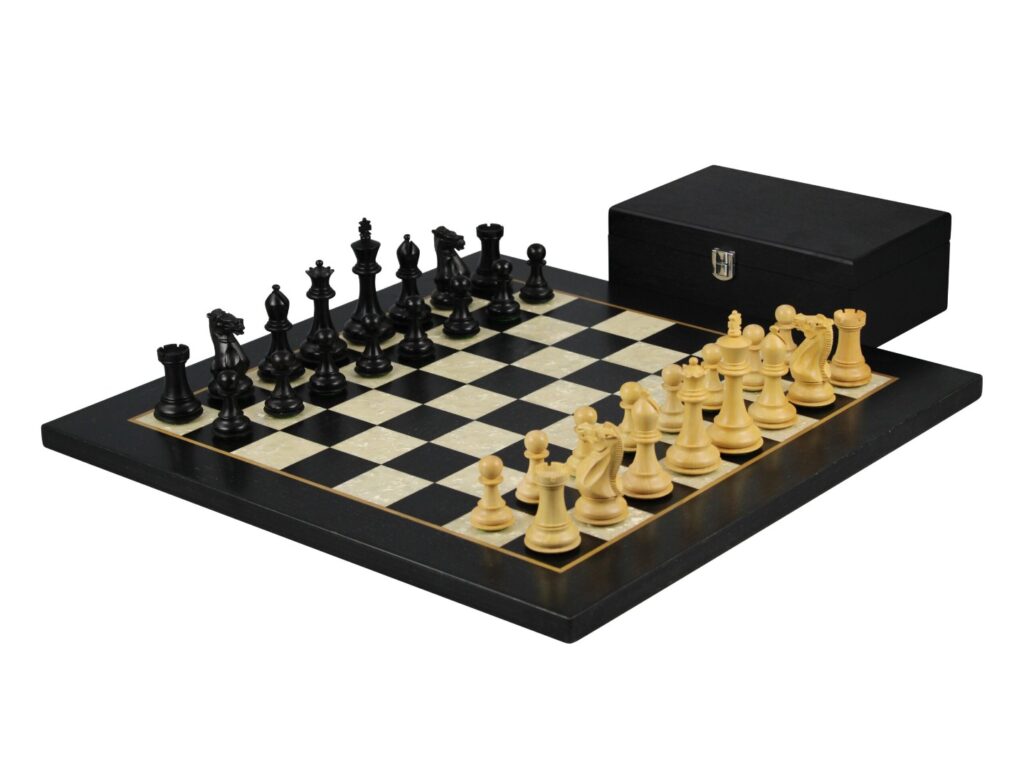 Ebenholz-Schachset 20 Zoll mit flachem Schachbrett Helena Mother of Pearl und gewichteten ebonisierten Professional Morphy Staunton Schachfiguren 3,75 Zoll