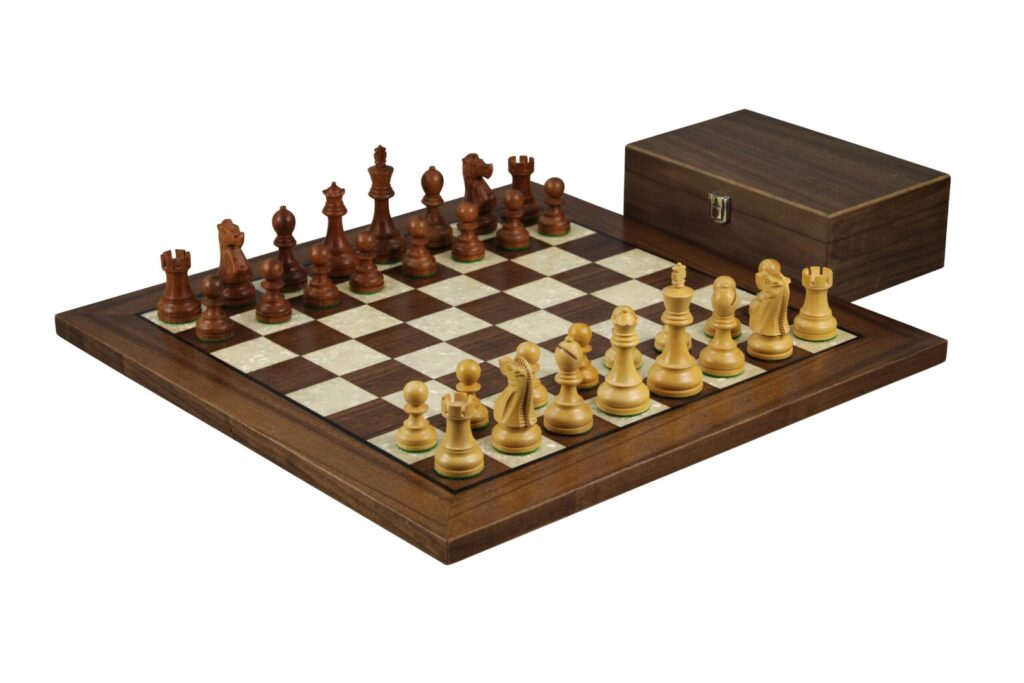 Walnuss-Schachset 20 Zoll mit Helena-Perlmutt-Flachschachbrett und gewichteten Sheesham Reykjavik Staunton Schachfiguren 3,75 Zoll