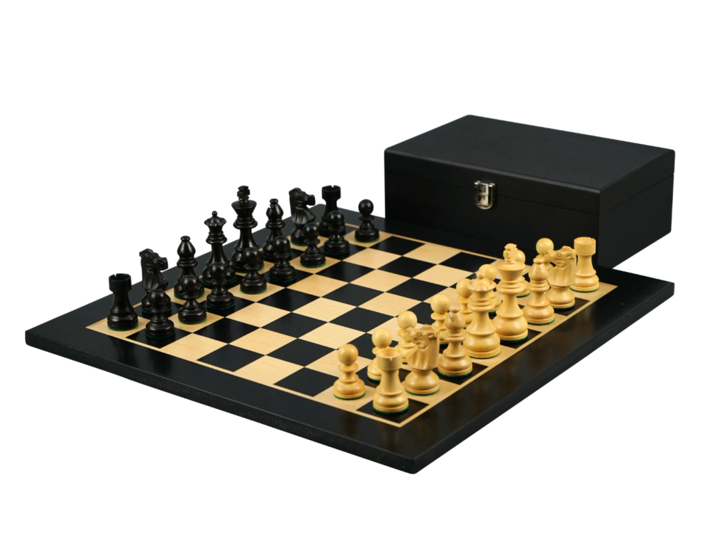 Ebenholz-Schachset 16 Zoll mit flachem Schachbrett und gewichteten Ebonised French Staunton-Figuren 3 Zoll
